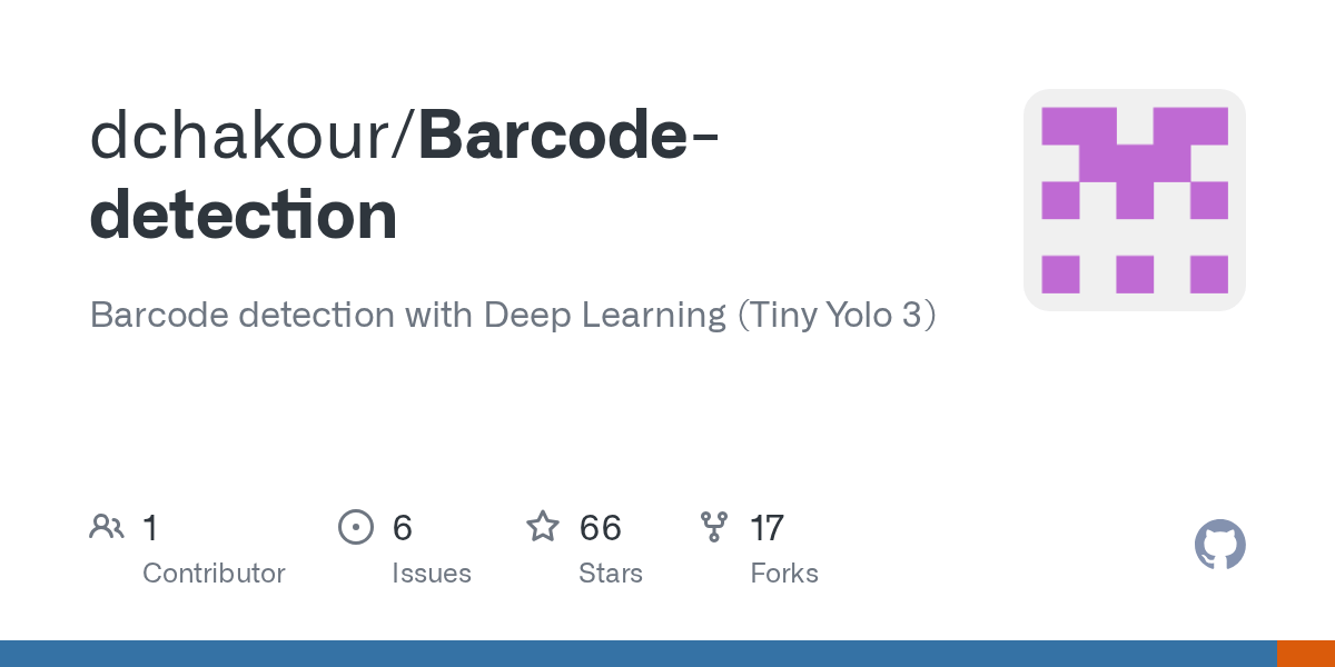 GitHub dchakour/Barcode-detection: Barcode detection with. . Barcode-detection. This project aims to develop a deep learning model able to detect a barcode in a given image. The model behind it is Tiny YOLO 3, which a light version of YOLO 3 with less hidden layers in the neural network architecture. This helps significantly reduce the inference time, although its predictive accuracy i… See more
